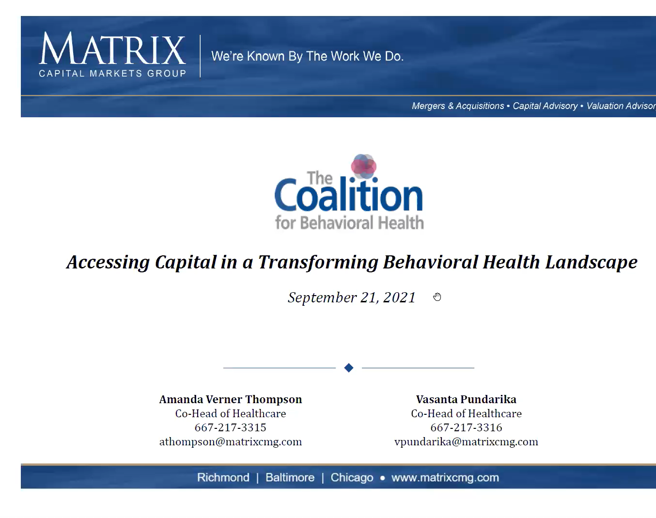 Presenters were Vasanta B. Pundarika and Amanda Verner Thompson, Co-Heads of Healthcare Investment Banking at Matrix Capital Markets Group.