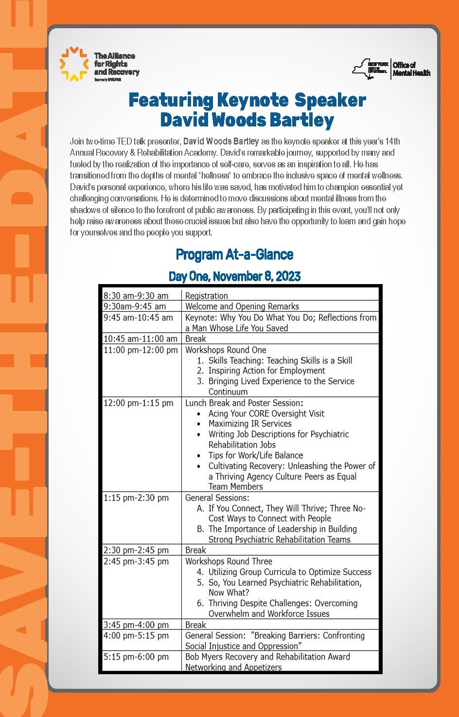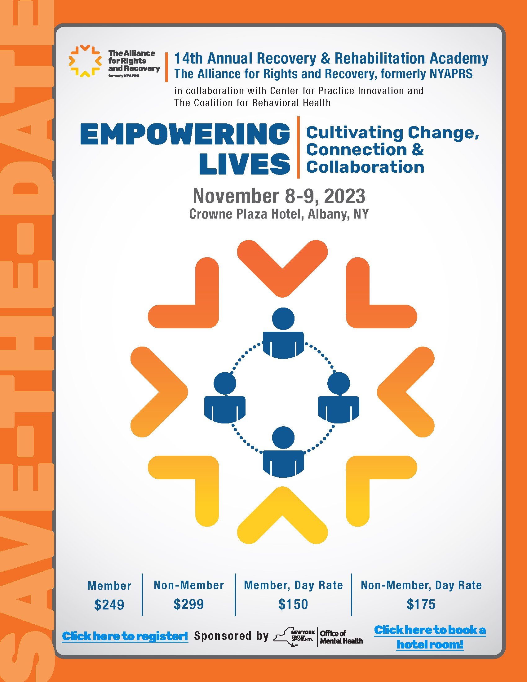 The Alliance for Rights and Recovery, formerly NYAPRS, is pleased to announce the program for the 14th Annual Recovery & Rehabilitation Academy. This year’s conference, “Empowering Lives: Cultivating Change, Connection and Collaboration” will be held on November 8-9 in Albany at The Crowne Plaza (formerly The Desmond Hotel). See below for details on the conference schedule, registration, and to take advantage of the discounted hotel rate.